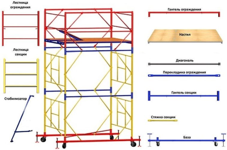 Зависимость высоты вышки-туры от количества секций (ярусов) и элементы вышки-туры:
